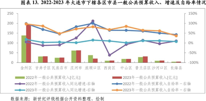 从增速看,2023年大连市下辖各区市县一般公共预算收入均实现正增长。其中,金州区增速最高居首,达18.0%;旅顺口区[14]、普兰店区、沙河口区和西岗区增速列第二梯队,增速均在10.0%以上;长海县增速为7.2%;其余区市增速在5.0%以下,中山区增速最小,仅为0.6%。金州区增速达18.0%,主要是当年非税收入增长所致;旅顺口区增速为14.7%,主要是上年实施了增值税大规模留抵退税政策,2023年不再受此政策影响,增值税增幅较大,以及非税收入增加;普兰店区增速为11.4%,主要是增值税等税收增加及太平街道组织填海罚没收入入库等因素影响非税收入增加所致;沙河口区增速为11.2%,主要得益于增值税及土地增值税等税收收入增加;西岗区增速为10.3%,由于上年增值税大规模留抵退税,当年增值税相对增幅较大。
