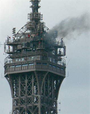 当日晚间,埃菲尔铁塔塔顶广播天线下一个房间突然起火,一股浓烟从塔顶冒出。约4000名游客当时正在塔内观光游览,游客们被紧急疏散。消防人员也及时赶到现场救火,在一个小时之内火势就得到了控制。