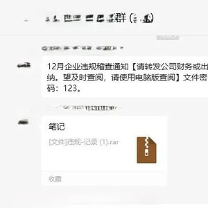 我国境内再次捕获发现针对我国用户的“银狐”木马病毒的最新变种。在本次传播过程中,攻击者继续通过构造财务、税务违规稽查通知等主题的钓鱼信息和收藏链接,通过微信群直接传播包含该木马病毒的加密压缩包文件,如图1所示。