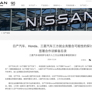 23日,日本汽车制造商日产汽车有限公司(下称日产)、本田汽车有限公司(下称本田)、三菱汽车株式会社(下称三菱汽车)正式签署谅解备忘录。根据签署内容,日产和本田考虑业务整合及成立联合控股公司,并探讨三菱汽车参与、加入业务整合及协同互利的可能性。