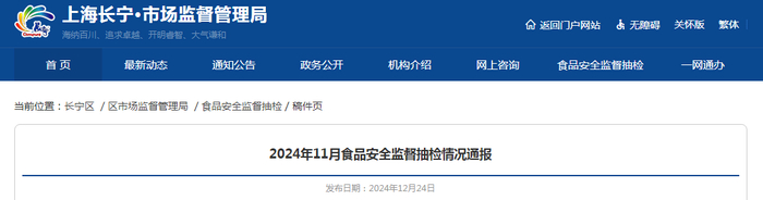 上海市长宁区市场监督管理局2024年11月食品安全监督抽检情况通报