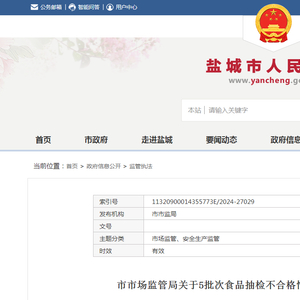 江苏省盐城市市场监管局关于5批次食品抽检不合格情况的通告(2024年第20期)
