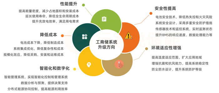 根据下游应用对安全性和经济性的核心诉求,工商业储能系统升级的方向主要包括性能提升、降低成本、安全性提高、智能化和数字化以及环境适应性增强等。