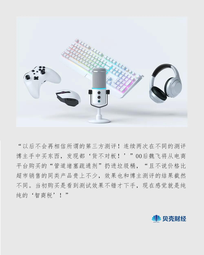 “以后不会再相信所谓的第三方测评!连续两次在不同的测评博主手中买东西,发现都‘货不对板!’”00后魏飞将从电商平台购买的“管道堵塞疏通剂”扔进垃圾桶,“且不说价格比超市销售的同类产品贵上不少,效果也和博主测评的结果截然不同。当初购买是看到测试效果不错才下手,现在感觉就是纯纯的‘智商税’!”