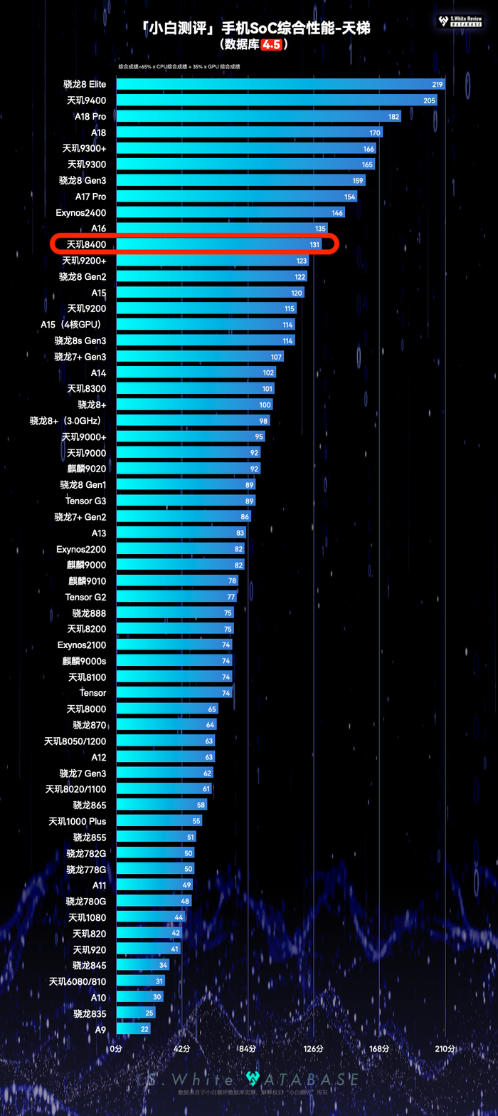 整体来说,天玑8400在数据库4.5天梯图SoC综合131分,要高于骁龙8 Gen2和天玑9200+。PS.以上成绩基于天玑8400工程机测得,先供大家参考,后续量产机表现如何我们也会进一步测试。