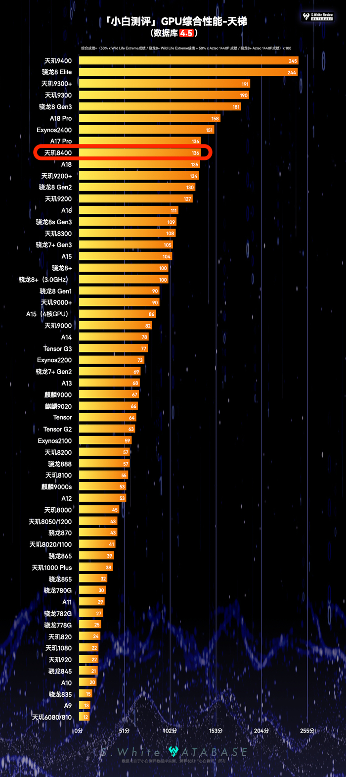 在数据库4.5 GPU性能天梯中综合136分,略高于天玑9200+。