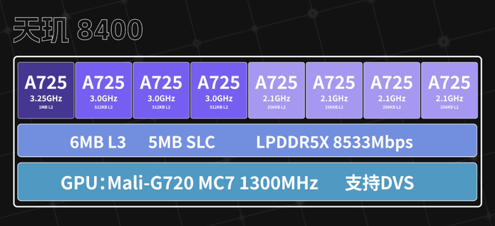 首先是规格方面,天玑8400采用台积电4nm制程工艺;CPU是8个A725的大核设计,划分为1+3+4的丛集,频率分别为3.25GHz、3.0GHz和2.1GHz;GPU为7核的Mali-G720,最大频率为1.3GHz,并支持DVS(延迟顶点着色管线,在游戏中,可以大幅节省带宽,从而降低功耗)。