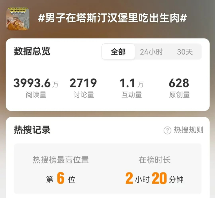 12月25日,“男子在塔斯汀汉堡里吃出生肉”一话题登上热搜。