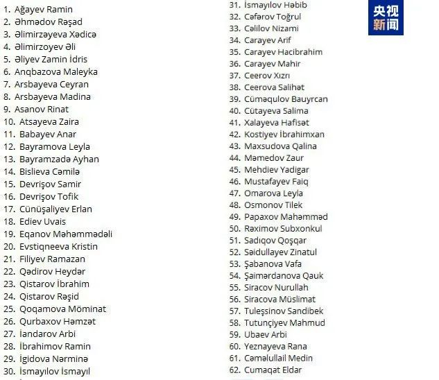据哈萨克斯坦紧急情况部最新消息,机上共有67人,其中5名为机组人员。当天,阿塞拜疆航空公司发布坠毁客机上的62名乘客名单。