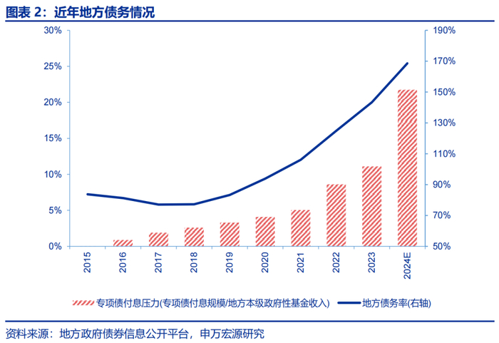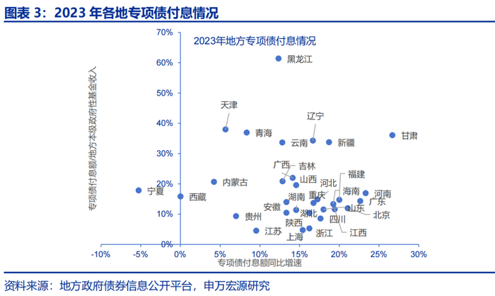地方土地出让收入承压下,部分地区专项债付息压力提升。从各地专项债付息压力看,2023年黑龙江、天津、青海等地专项债付息规模占其本级政府性基金收入比重超35%,甘肃、河南等地专项债付息规模增速超20%,或指向防范地方债务风险,除了发行“置换债”大规模化解隐性债务,可能也需要综合施策缓解专项债务付息压力。