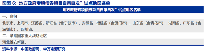 专项债审核机制重大变革,允许经济大省等开展专项债券项目“自审自发”试点。《意见》下放专项债券项目审核权限,“自审自发”试点地区包括北京市、上海市、广东省、江苏省、浙江省、等十省(含计划单列市)以及雄安新区。试点地区滚动组织筛选形成本地区项目清单,报经省级政府审核批准后不再报国家发展改革委、财政部审核,可立即组织发行专项债券。对“自审自发”以外地区,《意见》完善项目审核“绿色通道”机制,前期通过审核的在建项目,无需重新申报,经省级政府审核批准后可直接安排发行专项债券。