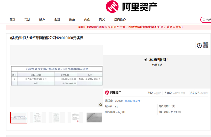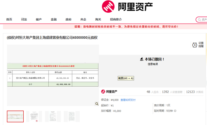 12月25日,记者注意到标的物“对恒大地产集团上海盛建置业有限公司4500万元债权”及“对恒大地产集团有限公司1.2亿元债权”已于今日陆续撤拍。阿里资产拍卖平台显示,拍卖撤回原因均为“信息有误”。