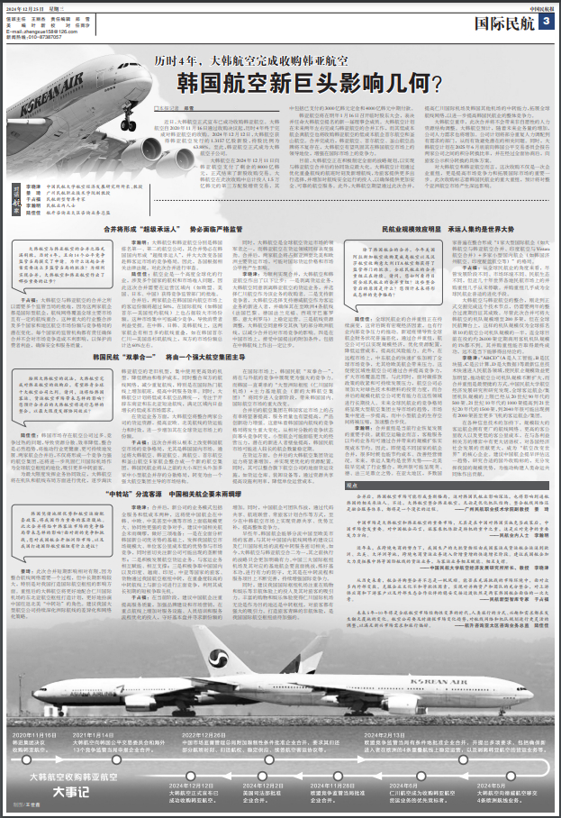 李晓津:合并后,新公司的业务模式包括全服务和低成本两种,这将使中国航企在中韩、中欧、中美甚至中澳等市场上面临规模更大、协同性更强的竞争对手。建议中国相关航企未雨绸缪,做好三项准备:一是在全面分析韩国新公司优劣势的基础上,发挥我国航空市场规模大、单位客公里成本低的优势参与市场竞争,同时密切关注新公司可能出现的垄断情形;二是积极发展航空货运业务,与客运业务相互赋能、相互支撑;三是积极争取中国国内以及印度、越南、印尼、中亚等国家的旅客、货物通过我国航空枢纽中转,在重叠度较高的中转航线上与新公司进行正面竞争,利用其成长初期的短板争取先机。