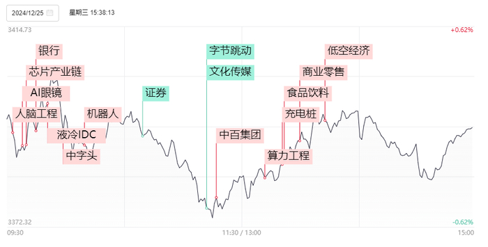 三大指数午后窄幅震荡集体收跌,截至收盘,沪指下跌0.01%,深证成指跌0.64%,创业板指跌0.55%。两市个股普跌,下跌个股4400只;两市全天成交1.28万亿元,较上一日缩量成交263亿元,内资主力资金净卖出567.7亿元;两市涨跌中位数为-2.13%。盘面上,市场情绪极差,权重股护盘稳指数,题材概念集体下行,亏钱效应明显。两市仅银行、保险等少数板块飘红,工商银行、农业银行、中国银行、建设银行股价盘中创历史新高。宇树机器狗概念持续活跃,实益达、景兴纸业、吉华集团涨停;零售等大消费概念午后拉升,中百集团、东百集团、香飘飘等多股涨停;AI眼镜、液冷概念表现强势,同星科技20CM涨停,创维数字等涨停。跌幅方面,题材概念全线下跌,微盘股指数大跌超3%,逾60只个股跌停,近百股跌超8%。数字经济概念集体重挫,国华网安、岭南股份等多股跌停;民爆概念走低,保利联合、高争民爆跌停;AI产业链集体下行,奥拓电子、城地香江、大位科技等多股跌停;字节产业链集体走低,汇洲智能、元隆雅图等多股跌停;农业、机器人产业链、半导体、券商、互联网金融等概念全线下跌。消息面上,1、据财联社,中小投资者“炒小炒差”等行为的减少情况将纳入监管对会员单位的考察范围;2、北京商报发文,四大行股价刷新历史新高,再次证明价值投资的魅力。