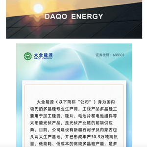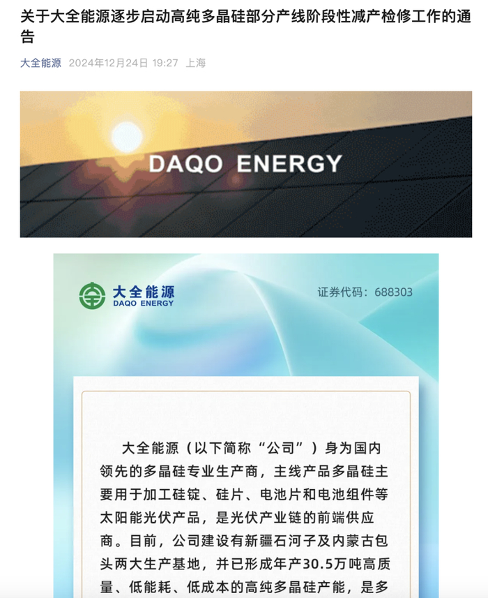 同样在12月24日晚间,大全能源发布逐步启动高纯多晶硅部分产线阶段性减产检修工作的通告称,大全能源身为国内领先的多晶硅专业生产商,主线产品多晶硅主要用于加工硅锭、硅片、电池片和电池组件等太阳能光伏产品,是光伏产业链的前端供应商。目前,公司建设有新疆石河子及内蒙古包头两大生产基地,并已形成年产30.5万吨高质量、低能耗、低成本的高纯多晶硅产能,是多晶硅行业主要的市场参与者之一。
