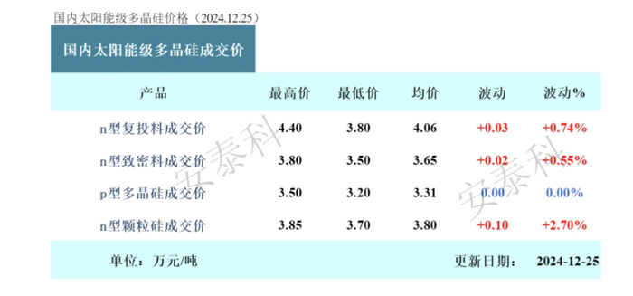 12月25日,中国有色金属工业协会硅业分会发布多晶硅周评称,企业公告检修减产,硅料价格小幅回升。