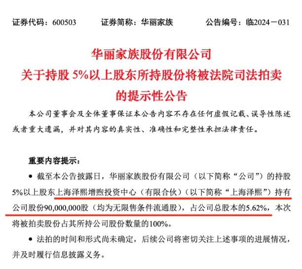 华丽家族(600503)公告称,公司于近日收到青岛中院发来的《执行裁定书》,青岛中院将拍卖公司持股5%以上股东上海泽熙增煦投资中心所持有的公司9000万股股票,占其所持华丽家族持股的100%,占公司总股本的5.62%。
