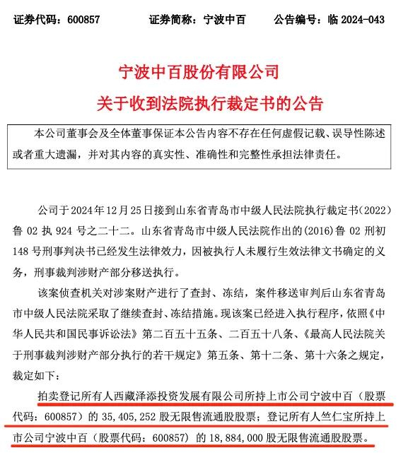 公告显示,该案侦查机关对涉案财产进行了查封、冻结,案件移送审判后山东省青岛市中级人民法院采取了继续查封、冻结措施。现该案已经进入执行程序,依照相关法律规定,拍卖登记所有人西藏泽添投资发展有限公司所持上市公司宁波中百的3540.53万股无限售流通股股票;登记所有人竺仁宝所持上市公司宁波中百的1888.4万股无限售流通股股票。