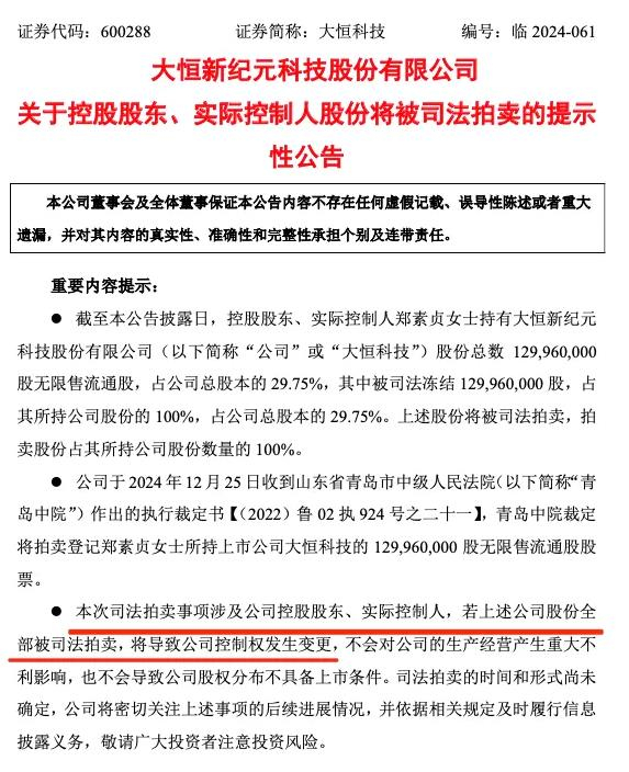 大恒科技此次拍卖公告也显示,若上述公司股份全部被司法拍卖,将导致公司控制权发生变更。