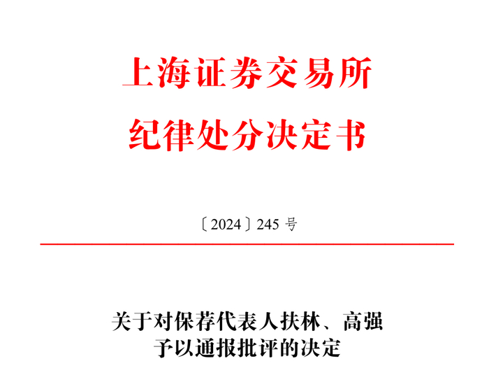 12 月 23 日,上交所对民生证券予以监管警示,对保荐代表人扶林、高强予以通报批评;