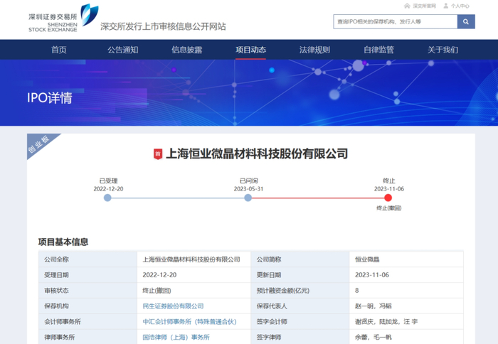 上海恒业微晶材料科技股份有限公司计划在创业板上市,审核状态为终止(撤回),注册地在上海,同样属于化学原料和化学制品制造业,保荐机构是民生证券,律师事务所为国浩律师(上海)事务所,会计师事务所为中汇,相关信息更新于 2023 年 11 月 6 日,受理于 2022 年 12 月 20 日;
