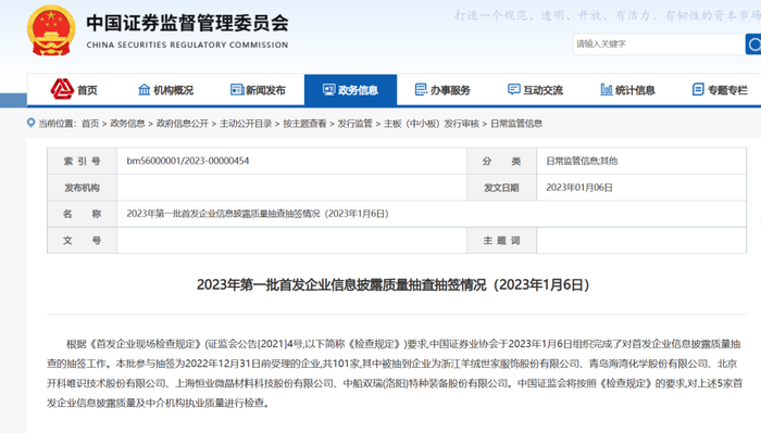 根据《首发企业现场检查规定》(证监会公告[2021]4号,以下简称《检查规定》)要求,中国证券业协会于2023年1月6日组织完成了对首发企业信息披露质量抽查的抽签工作。本批参与抽签为2022年12月31日前受理的企业,共101家,其中被抽到企业为浙江羊绒世家服饰股份有限公司、青岛海湾化学股份有限公司、北京开科唯识技术股份有限公司、上海恒业微晶材料科技股份有限公司、中船双瑞(洛阳)特种装备股份有限公司。中国证监会将按照《检查规定》的要求,对上述5家首发企业信息披露质量及中介机构执业质量进行检查。