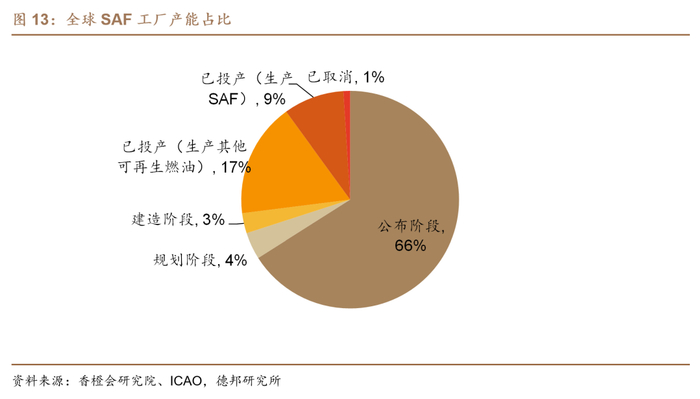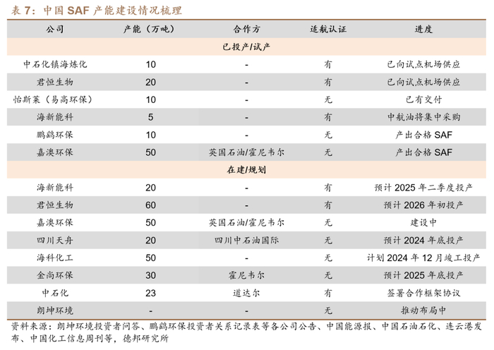 海外产能不确定性加大,供给格局或超预期偏紧。据ICAO和香橙会研究院,截至2024年10月,全球已投产且实际可用的SAF总产能约为200万吨,占全部SAF生产能力的9%。同时10月Neste新加坡工厂产线因不可预见的设备故障导致关闭,虽未影响SAF生产,但考虑到去年同样是Neste新加坡工厂也发生过设备故障导致生物柴油和SAF产能受损,其稳定生产能力或尚有待验证,以及Neste鹿特丹工厂也在11月8日发生火灾,紧急关停产线数周时间,海外实际供应端问题频发。新增产能方面,近期在全球SAF工厂中已有9个工厂项目由于资金压力等原因被取消,包括Fulcrum BioEnergy在美国的7家工厂、Shell在荷兰的1家工厂、Uniper在瑞典的1家工厂,合计影响潜在可投放产能超100万吨。我们认为,海外产能稳定性担忧叠加投产节奏放缓,SAF实际供给格局或持续偏紧,后续将持续跟踪海外大厂复产与新产能投放节奏。