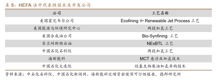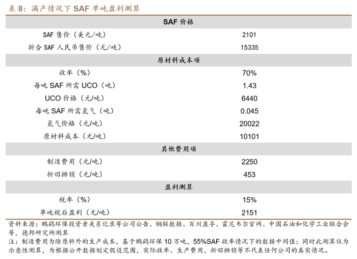 2)据70%收率推算,单吨SAF需消耗原料油1.43吨,另据深圳市氢能与燃料电池协会,单吨SAF约需要0.03-0.06吨外供氢辅助,取中间值0.045吨。