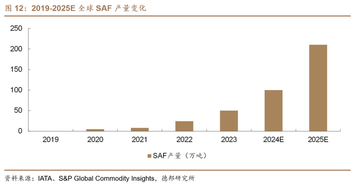 世界范围内SAF的生产和应用尚处于萌芽阶段。据IATA,2019-2023年全球SAF产量从0提升至约50万吨,其预测2024年SAF产量将达到100万吨,仅占2024年航空燃料总产量的0.3%,大幅逊于此前所预计的150万吨的年产量,主要系美国SAF生产设施的新增产能将推迟至2025年上半年投放。2025年,IATA给出的SAF产量预计为210万吨,占航空燃料总产量的0.7%。我们认为,SAF产量呈指数级增长的态势正在逐步显现,但产业趋势起点背景下不必过分担忧超量供应,远期广阔的市场空间仍有能力充分消纳。