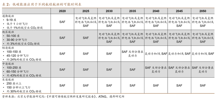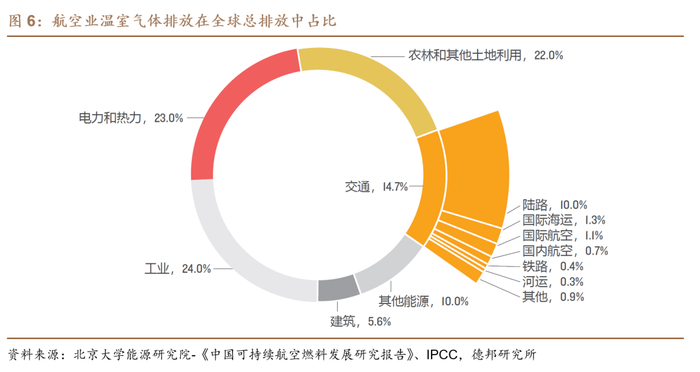 航空排放量占比仍有上升预期,航空减排对全球减排意义重大。2019年,交通领域是全球温室气体排放的第四大来源,占全球总排放的14.7%,其中航空业又是仅次于陆路交通的第二大交通领域温室气体排放源,占全球总排放的1.8%,对应约10.6亿吨二氧化碳当量。据《中国可持续航空燃料发展研究报告》,随着航空业未来的发展,其产生的温室气体排放绝对量和占比预计将不断增大,结合CAEP的分析,如果航空业不做出额外的减排努力,那么国际航空将产生的排放量约占总排放量的7.0%,如果采取不同程度的努力,将可以把排放量占比减少到3.1%-5.6%的范围。