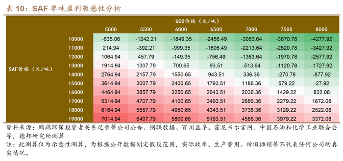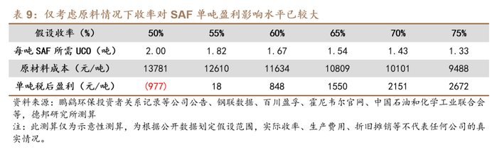 价格核心在于供需格局,成本核心来自收率提升。①价格方面,据钢联数据,SAF(FOB欧洲)价格从11月初的1889美元/吨快速上涨至12月近2100美元/吨的均价,而同期原料UCO价格则从6800元/吨下跌至短期6300元/吨的低点,本轮涨价或反映了SAF供需趋紧的现象。根据ICAO和香橙会研究院,全球已投产且实际可用的SAF总产能约为200万吨,以Neste、Diamond Green和World Energy为主。由于近期Neste新加坡工厂因设备故障导致关闭、鹿特丹工厂也因火灾影响生产数周,海外不可抗力频发,且今年已有9个拟建项目由于资金压力取消,合计影响潜在产能超100万吨,未来实际产能释放或不及预期。同期我国已有中石化镇海炼化、君恒生物、易高环保、海新能科具备SAF产能,随着鹏鹞环保和BP参股的连云港嘉澳合计约60万吨的新产能在今年相继投放,四川天舟、海科化工与海新能科亦在年底或明年初有投产预期,SAF全球行业格局有望重塑,价格端需关注海外扰动产能复产与新产能投放进度能否匹配需求释放节奏。②成本方面,原材料、技术路线等均影响SAF成本,但收率是构成规模效应的最核心变量,当前主流工艺包收率已可达70%左右,据此我们构建了一个相对中性的盈利测算模型,在当前SAF售价与原材料价格水平下,不考虑副产品销售的SAF税后盈利已可达2151元/吨,若考虑副产品销售则能够进一步增厚利润。同时收率越高的情形下理论上原材料成本与单吨折旧摊销费用越低,有望巩固规模优势,考虑到当前SAF价格或已具备一定盈利空间,拥有更高收率优势的生产企业有望更大化受益。
