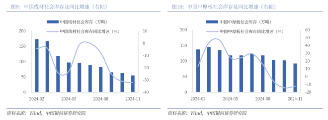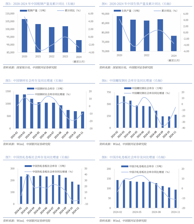 粗钢产量呈下降趋势,各类钢材去库效果显著。在政策明确要求“加强钢铁产能产量调控”的情况下,叠加地方政府面临“能耗双控”目标完成情况考核,2024年我国粗钢和生铁产量明显下降,我国钢材社会库存也呈下降趋势。国家统计局数据显示,2024年1-11月全国粗钢累计产量92919.0万吨,同比下降2.70%;2024年1-11月生铁累计产量为78277.0万吨,同比下降3.50%。截至2024年11月,我国钢材社会库存683万吨,同比下降9.54%,环比下降2.43%。从不同品种来看,我国螺纹钢、热轧、冷轧、线材、中厚板社会库存分别为278.0、164.0、94.0、55.0、92.0万吨,同比增速分别为-5.12%、-3.53%、-11.32%、-32.10%、 -12.38%。
