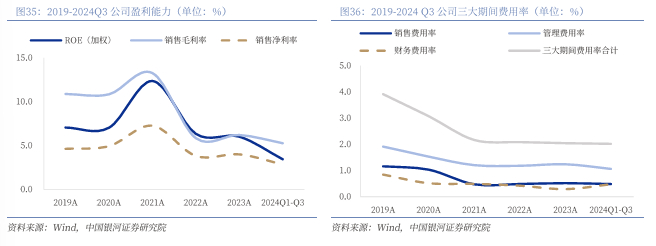 龙头宝钢股份领跑国内钢铁行业,硅钢高端产品国际领先。公司生产高技术含量、高附加值的碳钢薄板、厚板与钢管等钢铁精品。主要产品被广泛应用于汽车、家电、石油化工、机械制造、能源交通等行业。2024年前三季度宝钢股份实现营业收入2428.56亿元/-4.91%,营收规模均排名钢铁行业第一;2024年前三季度三大期间费用率合计2.02%,较2023年下降0.02pct,随着国家利好政策的不断推出,未来经营业绩有望边际改善带动行业向好发展。