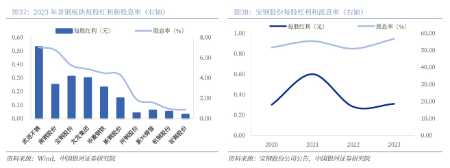 政策鼓励优质央企提升股息率,公司维持较高分红水平。2024年4月12日,国务院印发了《关于加强监管防范风险推动资本市场高质量发展的若干意见》,新“国九条”提出强化上市公司现金分红监管,加大对分红优质公司的激励力度,多措并举推动提高股息率。增强分红稳定性、持续性和可预期性,推动一年多次分红、预分红、春节前分红。从钢铁行业年度累计分红来看,2023年普钢板块24只个股中宣告分红的有10只,占比41.7%。其中宝钢股份年度累计分红排名第二,每股分红为0.31元。从股息率来看,2023年普钢板块股息率前三为武进不锈、南钢股份、宝钢股份,分别为7.02%、6.76%、5.23%。