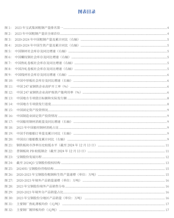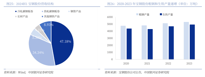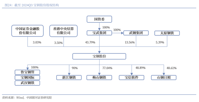 实际控制人为国务院国资委,子公司四大基地协同发展。截止2024Q3,公司前十大股东合计占总股本比例75.33%,第一大股东为中国宝武钢铁集团,持股比例为43.79%,实际控制人为国务院国资委。其中,武钢集团有限公司持股13.56%,太原钢铁有限公司持股5.39%,香港中央结算有限公司持股3.5%,中国石油天然气集团有限公司持股3.23%。截至2024Q3,公司拥有全资子公司烟台鲁宝钢管有限责任公司、上海宝钢国际经济贸易有限公司、上海宝钢资产管理有限公司、武汉钢铁有限公司等,控股子公司宝钢湛江钢铁有限公司、上海梅山钢铁股份有限公司、宝武碳业科技股份有限公司等,并以48.89%参股上海宝信软件股份有限公司。公司拥有分别设立在美国、日本、德国、新加坡、中国香港等国家和地区的各级子公司25家、参股公司4家。公司拥有上海宝山、武汉青山、湛江东山、南京梅山等主要制造基地,是全球碳钢品种最为齐全的钢铁企业之一。其中宝山基地为宝山钢铁股份有限公司位于上海宝山区域的生产制造基地,青山基地为武汉钢铁有限公司,东山基地为宝钢湛江钢铁有限公司,梅山基地为上海梅山钢铁股份有限公司。