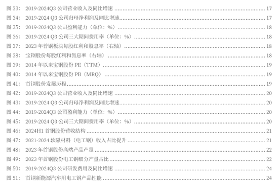 高端产品研发见成效,锻造关键核心技术长板。 2024年前三季度研发费用4.24亿/+31.27%,以技术创新为引领,公司在新产品研发、关键工艺技术方面持续取得新突破。新产品研发方面,实现取向电工钢15SQF1250、无取向电工钢ESW1021、高强汽车用钢980TBF等6款新产品首发。其中,15SQF1250产品是面向未来的中频取向电工钢新产品,为风电、光伏等新能源发电直流汇集新技术提供关键核心材料,满足未来电网交直流柔性互换的发展要求;高强度低铁损无取向电工钢ESW1021,助力高速电机行业高质量发展;高强汽车用980TBF强度更高,性能更优,满足下游客户的更高需求。持续推动“替代进口”国产化项目26项,形成供货8万吨。关键工艺技术方面,首创六机架六辊轧机冷连轧高牌号硅钢的工艺装备技术,实现新能源汽车驱动电机用无取向电工钢和高效节能变压器用取向电工钢的连轧突破,产品横向厚差小于等于5μm的比例 96%,达世界领先水平;首创热轧超薄高强钢带多模式连轧工艺,实现无头模式下1.1mm 厚度980MPa级别产品的高效生产,提升薄规格、高强度带钢轧制效率,提高生产组织灵活性。