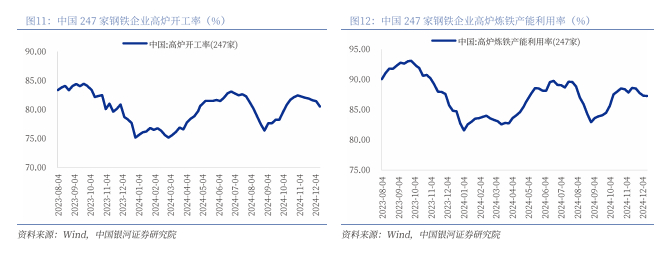 年初以来我国钢铁行业经历两次减产,分别在1-3月和8-9月。在全国247家样本钢企中,2024年11月国内高炉平均开工率为80.53%,环比下降0.92pct;国内高炉炼铁产能利用率为87.26%,环比下降0.05pct。