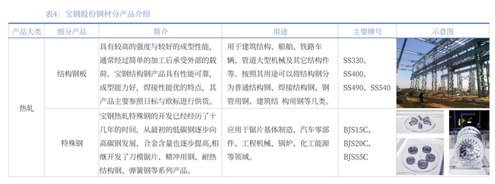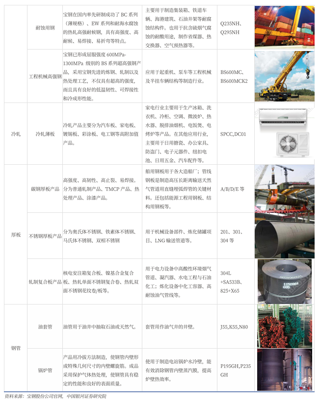 公司广泛布局各品类钢材,硅钢高端产品处国际先进水平。公司专业生产高技术含量、高附加值的碳钢薄板、厚板与钢管等钢铁精品。主要产品被广泛应用于汽车、家电、石油化工、机械制造、能源交通等行业,从制造、研发、营销、服务四大维度,形成汽车用钢、电工钢、能源与管线用钢、高等级薄板、镀锡板、高等级厚板产品等六大战略产品。公司整体技术装备建立在当代钢铁冶炼、冷热加工、液压传感、电子控制、计算机和信息通讯等先进技术的基础上,具有大型化、连续化、自动化的特点,处于世界钢铁行业领先者地位。公司自主研发的新一代汽车高强钢、电工钢、高等级家电用钢、油气管、桥梁用钢、热轧重轨等高端产品处于国际先进水平,紧密关注中国高端制造业如军工、核电、高铁、海工装备、新能源汽车等产业的高速增长,发展包括超高强钢、取向硅钢在内的高端产品,并研发储备更高端新材料技术,集中力量“从钢铁到材料”,持续享受高端产品结构带来的经济效益。