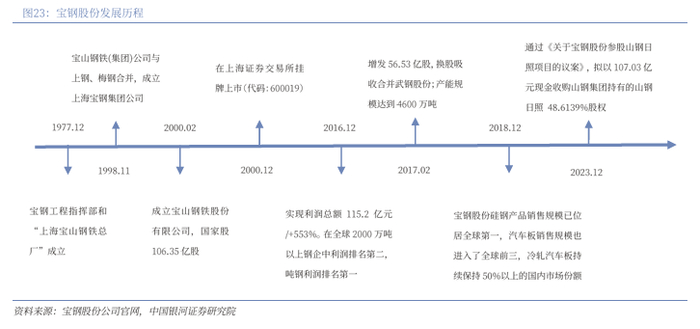 全球领先的现代化钢铁联合企业,稳居中国钢铁行业龙头。1977年12月,经国务院批准,宝钢工程指挥部和“上海宝山钢铁总厂”成立;1998年11月,宝山钢铁(集团)公司与上钢、梅钢合并,成立上海宝钢集团公司;2000年2月,宝山钢铁股份有限公司成立,同年12月,在上海证券交易所挂牌上市(代码:600019)。2016年,宝钢股份实现利润总额115.2亿元,同比增加553%;实现净利润89.66亿元,同比增长849%;在全球2000万吨以上钢企中利润排名第二,吨钢利润排名第一。2017年2月增发56.53亿股,换股吸收合并武钢股份,产能规模达到4600万吨,合并后宝钢股份在全球上市钢铁企业中粗钢产量排名第三、取向硅钢产量排名第一。2018年,宝钢股份硅钢产品销售规模位居全球第一,汽车板销售规模也进入了全球前三,冷轧汽车板持续保持50%以上的国内市场份额。2023年12月,宝钢股份召开第八届董事会第三十六次会议审议通过《关于宝钢股份参股山钢日照项目的议案》,拟以107.03亿元现金收购山钢集团持有的山钢日照48.61%股权。