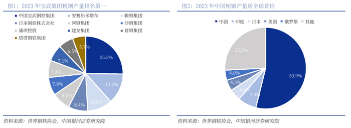 中国粗钢产量居全球首位,宝武集团市占率领先。1967年世界钢铁协会成立时,美国、西欧和日本的钢产量占世界总产量的61.9%,2000年下降至43.8%。从2011年起,新兴经济体生产和使用了超70%的钢材,中国占45%左右。2023年,据世界钢铁协会数据,全球粗钢产量18.92亿吨,同比+0.52%。其中产量前五的国家保持不变,为中国、印度、日本、美国、俄罗斯,粗钢产量分别为10.19、1.41、0.87、0.81、0.76 亿吨,占比分别为53.9%、7.4%、4.6%、4.3%、4.0%。2023年全球产量前10的企业中国占6家,前5的企业分别为中国宝武钢铁集团、安塞乐米塔尔、鞍钢集团、日本制铁株式会社、河钢集团,粗钢产量为1.32、0.69、0.56、0.44、0.41 亿吨。