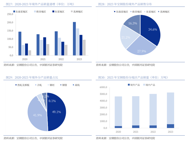 高附加值硅钢产品拓展海外市场,境外产品有望保持高增速。截至2023年年末,公司拥有分别设立在美国、日本、德国、新加坡、香港等国家和地区的境外各级子公司21家、参股公司4家,公司在国际市场的竞争力逐步提升。公司境外产品销量逐年增长,2023年境外销量合计583.9万吨/+46.7%。分地区看,2023年公司产品在东南亚地区销量202.0万吨/+39.0%,占境外产品销量34.6%;欧非地区销量162.9万吨/+53.2%;东亚地区销量123.8万吨/+50.2%;美洲地区销量95.2万吨/+48.5%。公司聚焦“从制造到服务”和“从中国到全球”,通过服务先期介入、完善客户端需求驱动机制、产销平衡决策支持系统、宝钢慧创平台、快速响应完善的营销服务体系以及钢铁服务平台的快速战略布局等,以遍布全球的营销网络为客户提供一流的产品、技术和服务,在满足国内市场需求的同时,产品出口日本、韩国、欧美等七十多个国家和地区。公司全年汽车板出口创历史新高,高附加值产品大幅增长,携手国际知名车企整合上下游优势,打造新型伙伴关系;硅钢出口以跨国变压器集团及新能源、汽车用户为核心,加大新市场开拓力度,出口数量持续增长、出口结构进一步优化,高附加值产品比例提升显著;冷板类重点品种出口增量明显,酸洗汽车品种钢出口量同比增长62%。