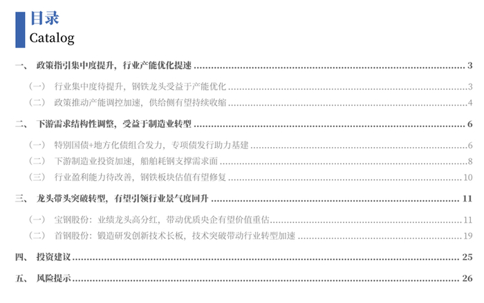 近年来钢铁行业景气度偏弱,个股回落到较低估值,我们认为随着行业供需格局的改善,龙头钢企的盈利能力和估值有望迎来修复。从供给侧看,产业政策持续显效,钢铁产能呈现收缩趋势,行业集中度有望持续提升;从需求侧看,两新政策助力下游制造业投资加速,船舶等耗钢支撑需求面,行业有望受益于制造业改造升级。建议关注:政策利好预期带来需求边际改善的普钢板块龙头公司,基本面向好的特钢板块相关龙头公司等。