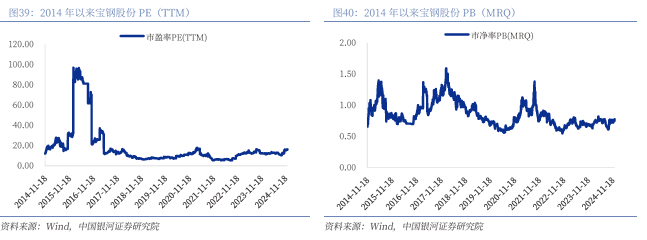 公司估值处于历史低位。截止2024年12月13日,宝钢股份PB仅0.78倍。由于近年来钢铁行业景气度较弱,个股回落到较低估值。公司作为行业龙头,随着未来供需格局的改善,盈利能力有望改善,有望带动板块整体估值修复。