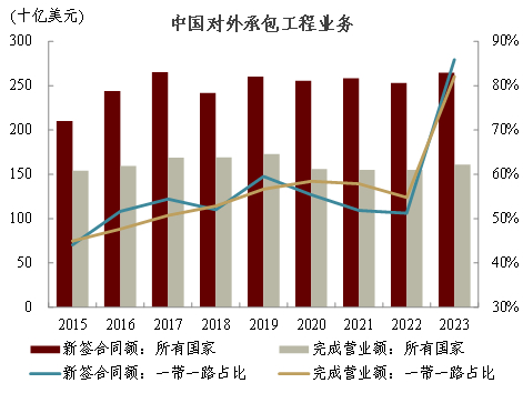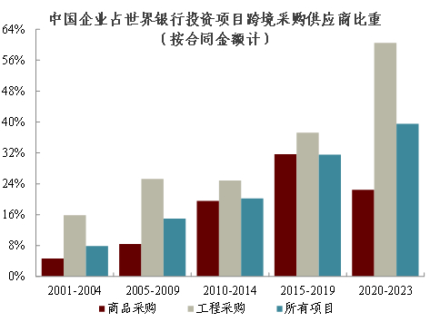 中国当前已具备开展多边合作的优势。在公共部门层面,中国在世界银行、联合国、WTO等国际主要多边机制中已具备一定影响力;在RCEP等区域经贸协定框架下开展的跨境投资与产业合作项目,也为推动发展融资多边化提供借鉴。特别地,加入G20缓债倡议(DSSI)是中国在该领域参与多边机制的重要突破。在私营部门层面,中国企业和金融机构在“走出去”的过程中积累了丰富的开展国际合作的经验。一方面,中国基建企业的能力已获得国际社会广泛认可。例如,在世界银行出资支持的基建项目中,由中国企业获得的跨境合同承包额比重呈上升趋势(图表9)。另一方面,中国金融机构出海初见成效,截至2023年6月末已有13家中资银行在50个“一带一路”共建国家设立了145家一级机构,影响力持续扩大[64]。