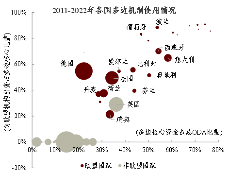 欧盟区域一体化程度较高,其发展融资模式具有显著的“集体行动”特点:欧盟国家往往更倾向于提供多边核心融资,且这些资金多数流向欧盟相关援助机构,如欧盟委员会、欧洲投资银行等。2011-2022年,欧盟27国平均有一半以上的对外援助通过多边核心渠道发放,其中超过2/3由欧盟机构决策和管理;而同期20个非欧盟国家平均仅有不到20%的ODA为多边核心融资。在成员国的共同支持下,欧盟机构拥有较强的执行能力,因此其对外援助几乎不再二次提供给其他多边机构,而是长期有高于80%通过双边机制进行(图表19,图表20)。换言之,欧盟机构及其成员国形成了较为完整的区域合作体系,其较全球多边体系而言覆盖范围更小、可利用资源更少,但具备后者的主要架构与治理模式,且各国利益一致性更高,易开展集体行动以达成共同目标。