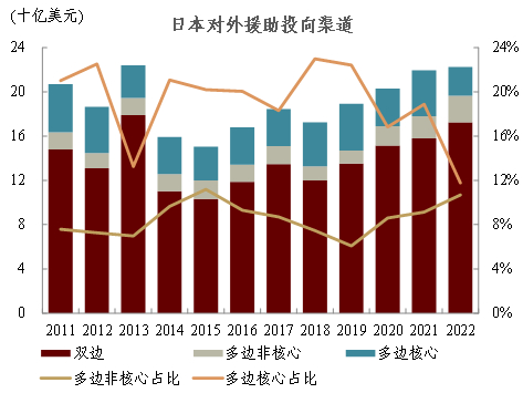 图表14:日本倾向于提供双边援助,近年来多边核心资金占比明显下降