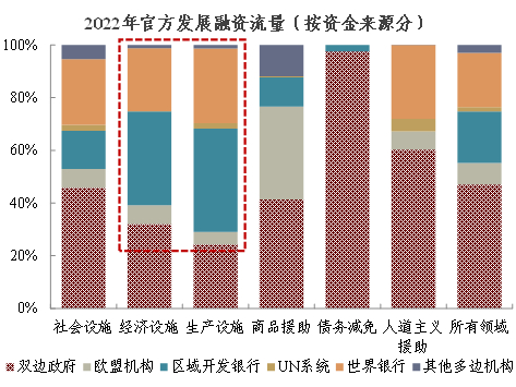在此趋势下,多边机制为发展中国家提供资金、促进可持续增长的作用正得到更多重视。直观上,这体现为多边资金规模提升,并在金融条件收紧、经济下行时期发挥稳定器的功能:21世纪头10年,平均每年有42%的官方发展融资[6]通过多边渠道[7]投向发展中国家,2010年代增长至49%;2020-2023年全球经济经历多重冲击,期间多边资金的规模超越双边,在官方融资中的占比进一步上升至55%(图表1)。在基础设施领域,多边机制的重要性更为显著,2022年为发展中国家的经济设施与生产设施分别提供了68%与76%的官方发展融资(图表2),并在非洲等欠发达地区,以及交通、新能源等正外部性较高的部门发挥关键作用[8],弥补私营部门和双边政府资金供给的不足。