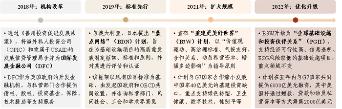 相似的多边化策略也体现在美国海外基础设施倡议的推广和实施过程中。2018年以来,美国以开发金融机构改革为起点,陆续推出“蓝点网络”(BDN)、“重建更美好世界”(B3W)、“全球基础设施和投资伙伴关系”(PGII)等多个全球基建倡议(图表13)。这些基建倡议通常具有“多边引领规则、市场执行落地”的特点:多边机构提供技术支持并推广相关规则,补充双边机制在专业知识和国际影响方面的短板。私营部门是项目的主要投资和执行者,有生产要素和经验、渠道等方面的优势,可在建设过程中持续形成并践行基建理念与标准。美国政府则起到引领协调的作用,负责统筹多双边官方机构、动员私营部门。这不仅能够发挥美国的国际影响力以及市场体系发达的优势,更有助于其规避政策目标不稳定、财政资源有限、发展融资体系碎片化等问题[88]。