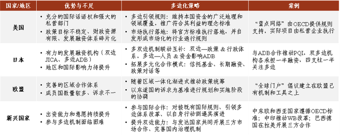 展望未来,提升基建投资的多边化水平与效率,需要立足于中国的优势和需求,形成以双边、三方和多边合作机制为支撑的复合型架构[82]。特别是随着中国对外合作范围持续拓展,考虑到各地区和国家社会文化背景和经济发展水平参差不齐,更应注重不同层次合作机制的兼容并蓄[83]。这需要思考以下问题:如何定义、区分多双边机制各自的功能,合理分配资源并进行统筹?如何更好地促进两种机制的互动,使双边行动受益于多边合作的优势?如何对接统筹跨行业、跨区域的规则,并鼓励更多国家参与共建?如何突破与国际治理体系的不兼容问题,实现从双边到多边的转型?美国、日本、欧盟、新兴国家的经验或可提供一定借鉴。