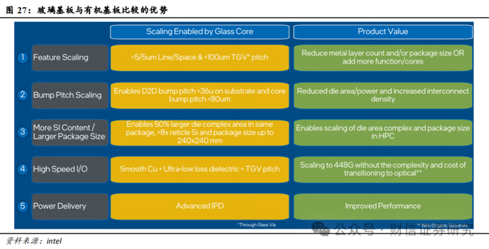 玻璃基板的优点包括:更小的特征尺寸、更小的凸点间距、更强的封装表现等。英特尔对使用玻璃芯基板的优势和可能带来的价值总结如下:1)更小的特征尺寸。玻璃基板支持小于5/5um的线宽线距,以及小于100um的TGV通孔间距。这一优势可以使得玻璃基板减少金属布层、减小封装尺寸,或者提供更多的功能和核心。2)更小的凸点间距。玻璃基板支持间距小于36微米的D2D bump,小于80um的core bump。这一优势可以使得芯片面积和功耗减小,增加互连密度。3)更大的容量/封装尺寸。玻璃基板在相同的封装大小下能容纳更大、更复杂的芯片。另一方面,玻璃基板也能够实现更大的封装面积,可以高达240*240mm2。这一优势能够满足高性能计算领域更复杂的芯片和更大的封装需求。4)更高速的传输。玻璃基板支持更光滑的铜镀层、超低损耗介电材料以及TGV间距优势,使其能够更好实现高速数据传输。在不需要光互联的情况下,玻璃基板能实现448G信号传递。5)更好的电源管理。玻璃基板能够支持更先进的IPD(integrated passive devices,集成无源器件),从而提高产品性能表现。
